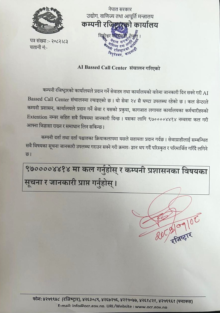 ९७००००४४१४ मा कल गर्नुहोस् र कम्पनी प्रशासनका विषयका सूचना र जानकारी प्राप्त गर्नुहोस् ।