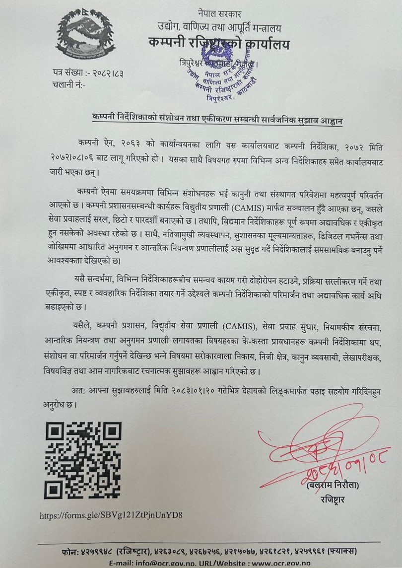 कम्पनी निर्देशिकाको संशोधन तथा एकीकरण सम्बन्धी सार्वजनिक सुझाव आह्वान